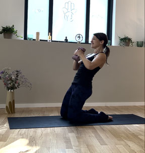 Im Sculpt Yoga kombinieren wir fließendes Vinyasa mit Workout Elementen (wie Squats, Lunges, Bicep Curls). Hierbei werden in vielen Übungen kleine Hanteln hinzu genommen, in der Regel 1-3 kg. Die Gewichte sind dabei immer optional, so dass jederzeit variiert werden kann.