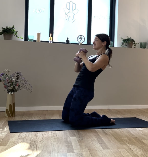 Im Sculpt Yoga kombinieren wir fließendes Vinyasa mit Workout Elementen (wie Squats, Lunges, Bicep Curls). Hierbei werden in vielen Übungen kleine Hanteln hinzu genommen, in der Regel 1-3 kg. Die Gewichte sind dabei immer optional, so dass jederzeit variiert werden kann.